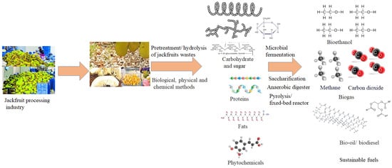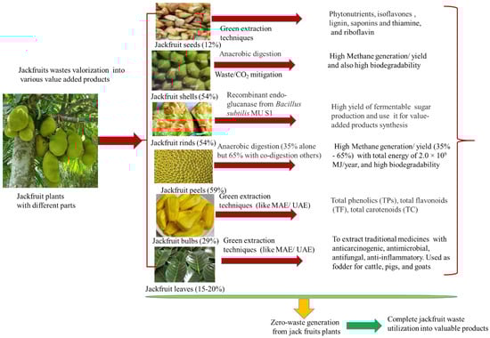 Jackfruit (Artocarpus heterophyllus L.) trees are known to produce huge fruits from their stems and are unique in terms of food utilization as vegetables and fruits. Jackfruit trees are cultivated throughout the lowlands in south and southeast Asian countries. In addition, it is found in east Africa, as well as throughout Brazil and Caribbean nations such as Jamaica. Many countries such as Malayasia, the Philippines, Cambodia, and Sri Lanka, including Bangladesh (where jackfruit is the national fruit), are taking aggressive efforts to bring about greater areas for jackfruit plantation; therefore, the production and productivity of jackfruit are likely to increase over the years, as will jackfruit waste. Jackfruit is one of the most demanded fruit crops in India too. In India, it is grown/cultivated in low-elevation regions throughout all the states [1]. Several wastes are generated from its ripe fruits and this fruit waste is more palatable than waste from raw fruit [1,2]. Jackfruit has shown various nutrients such as crude protein (CP ~7.9%), crude fibre (CF ~14.1%), calcium (0.8%), and phosphorus (0.1%). Except for these nutrients, ripe and raw jackfruit wastes are also utilized as potential substrates for energy production and nitrogen-free extracts (NFE ~65%). The rind of the ripe fruit is a good source for cattle foods and this waste of jackfruit is a non-edible portion (~59.2%), such as perianth meal, rind, and core meal. This waste matter is utilized for total dry meal recovery (11.6%) [2]. Some analyses have been performed on jackfruits waste compositions (for perianth meal, rind, and core meal), which contain ash (6 to 7.5%), carbohydrates (20–29%), crude protein (8–10.6%), crude fate (1.7 to 7.3%), and crude fibres (12–17.3%). Some studies have been conducted on the utilization of jackfruit wastes and these are used for food, feed, and other industry applications. Some non-edible portions of jackfruit (such as peels and axis) are reported with edible products (seed), and still, these waste matters are underutilized worldwide such as in Bangladesh, India, and other countries [3]. Different waste portions of jackfruits are generated during juicy edible bulbs. The thick peels of jackfruits can be utilized for different valuable product generations such as biofuel, non-porous adsorbents, and nutrient-enriched cattle feeds. Normally, non-porous adsorbent is used in the removal of dye. The peel and central axis of the jackfruit are also utilized for pectin extraction [4]. Its seed power is reported to be used in various bakery products. From this fruit, seed powder, starch, and protein fraction are isolated and then utilized in their purified form for food formulations at the industry level [1,3,4].