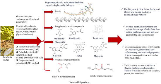 Nevertheless, huge quantities of various types of fruit and vegetable waste are generated due to different the processing activities in the food sector every year. These form excellent sources of different natural, valuable components such as biofuels and polyphenols and are utilized for different needs of human life [101]. Green extraction technology, often known as the non-traditional approach, has been a significant subject of research in recent years [102]. These green technologies have replaced previous traditional methods due to their high yield, shortened process time, products of superior quality, and low waste creation [98,100]. During the pre-treatment process, a disruption of the hydrogen bond is also found and can occur easily after the addition of a chemical solvent, and then it is heated at a high temperature. This can cause the dipole rotation of molecules and the migration of ions. These changes in matter can occur with the diffusion of the solvent and can lead to the dissolution of the components [103]. Another mechanism during the pretreatment process is reported as an evaporation of the moisture within cells, which can induce high pressure on the cell wall and then change the physical properties of the materials [104]. In turn, this leads to a modification in the porosities of biomaterials, resulting into an increased penetration of solvents with an improved yield of biomaterials [105,106]. Various types of bioproducts from jackfruit wastes are discussed in the below section.