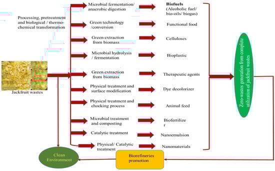 The valorisation of food and fruit wastes has the potential for the production of sustainable energy and biochemicals. Approximately 70% of the weight of the original jackfruit (Artocarpus heterophyllus L.) fruit is lost during its processing as waste in the form of peeled skin and core, both of which have not been utilized and, thus these contribute to disposal as well as pollution issues. The major components such as cellulose and hemicellulose can be easily biologically transformed into bioenergy sources such as ethanol, methanol, and butanol; valuable phenolics and biotechnological products such as pectin, citric acid, bromelain, ferulic acid, and vanillin; and many other products. These residues can also be utilized as essential sources for the biological transformation process, leading to the production of numerous products with added value, such as phenolic antioxidants, phenolic flavour compounds, and organic acids. Thus, the value addition of jackfruit waste can support sustainable solutions towards food and nutritional security. In this way, zero waste can be achieved through novel biorefineries, which are critically highlighted in this paper. Furthermore, novel technologies for the conversion of jackfruit waste are summarized with recent findings.