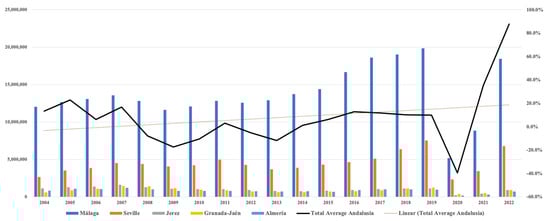 The literature review has addressed the importance of airports and the numbers of hotels and rooms in the tourism demand on the Andalusia destination. Moreover, the number of passenger arrivals at Andalusian airports has a direct impact on foreign and Spanish overnight stays and the occupancy rate of Andalusian hotels. Sánchez-Ollero et al. [94] note that Andalusian hotels can improve their occupancy levels and increase the number of overnight stays because of the proximity of the airports’ locations and the coastline. Figure 8 shows the correlation between the evolution of passenger arrivals at Andalusian airports analysed and the total overnight stays in the Andalusia destination and also its eight provinces. The tendency of growth in passengers and overnight stays from 2004 to 2019 is the same on the timeline. In 2020, we can see the same drastic fall in these two indicators because of the pandemic crisis, but in the years 2021 and 2022 the number of passenger arrivals and overnight stays are aligned in recovering to pre-pandemic levels.