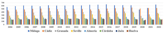 Number of hotels, by Andalusian province (2004–2022). Source: Own elaboration from IECA [2].