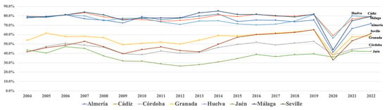 Hotel occupancy rate, by Andalusian province (2004–2022). Source: Own elaboration from IECA [2].