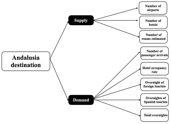 The data used in this work combine information coming from different statistical sources. In the period analysed, more than 35,320 observations were examined, that is, data per year and indicators assessed. To collect data, we used supply and demand data according to the IECA, INE, and AENA organizations (secondary data). To count the number of passenger arrivals at Andalusian airports, data were collected from Aeropuertos Españoles y Navegación Aérea, commonly known as AENA [20]. The rest of the indicators such as the number of hotels and rooms, hotel occupancy rate, and overnight stays at hotels by international and national tourists were collected from IECA [2,33], and INE [66,67]. It is important to note that this research provides updated data from 2022, which has helped to contextualize and measure the pandemic effects and compare them with those for earlier years.