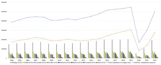 Total passenger arrivals at airports and total overnight stays by province (2004–2022). Source: Own elaboration from IECA [2]. Note: O-S is overnight stays.