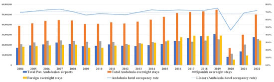 Total passenger arrivals at airports, hotel occupancy rate, and Spanish and foreign overnight stays in the Andalusia destination (2004–2022). Source. Own elaboration from IECA [2].