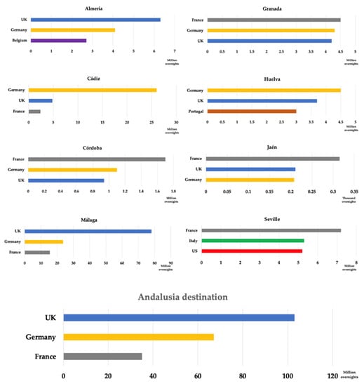 Therefore, the most remarkable research results are shown in Figure 11, which reveals the main three tourist markets in the Andalusia destination and its eight provinces in the period examined. English tourists are the backbone of tourism in the Andalusian territory in overnight stay terms with 103 million, the second market for Andalusian hoteliers are German tourists with 67 million overnight stays, and the third tourist segment that dynamizes and promotes the overnight stays at Andalusian hotel establishments are French tourists with 35 million overnight stays. These findings are completely aligned with the distribution of passenger traffic by European markets at Spanish airports, which were UK (27.2%), followed by Germany (17.6%), and France (10.1%) from 2015 to 2022 [17]. Gallego et al. [55] found that the over-reliance of the Spanish hotel industry on the UK, Germany, and France segments might be a long-term strength and weakness. When the economic situation is buoyant, these three tourist segments improve the economics of Andalusian tourist destinations and hotels’ overnight stays. Conversely, in difficult times and external crises such as the pandemic or financial crisis, these three segment markets can multiply the negative effects on hotels’ overnight stays and provoke a massive drop in tourism demand.