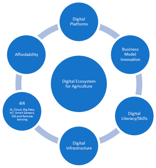 Many digital solutions developed to serve the agriculture sector already exist [14,15]. However, many smallholder farmers are beyond the reach of these digital solutions due to underdeveloped or nonexistent digital ecosystems [13]. Some of the challenges that make these digital solutions unsuitable for smallholder farmers’ contexts are the costs of service (affordability and lack of business model innovation), digital skills and digital literacy gaps (impacting the use of digital platforms), a lack of digital technologies (4IR) including smart devices, and digital infrastructure such as connectivity and mobile networking infrastructure for the Internet and broadband connectivity. Figure 1 depicts some of the elements of a digital agriculture ecosystem: namely, the digital platform to access agriculture information, markets, finance, agri-inputs, supply chain management, advisory services, and business intelligence; business model innovation; digital literacy or skills; digital infrastructure; 4IR (artificial intelligence (AI), cloud, big data, the Internet of Things (IoT), and smart and remote sensors); and affordability.