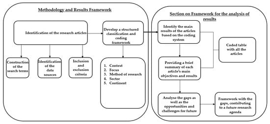 The systematic review was analyzed using the coding and classification framework developed by Amui et al. (2017) [16] based on other works [17,27,28,29,30]. The classification was performed using the following categories: context, focus, method, sector, and global locations in the form of origin or continents, as shown in Table 1. The low- and middle-income countries (LMICs) context emerged from the SLR.