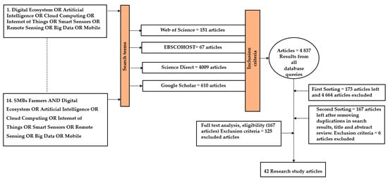 In the third iteration, exclusion criteria were used to exclude articles that failed the eligibility test because they mentioned only some of the specific search terms but did not solely focus on the research topic, digital ecosystems, nor did they focus on agriculture digital ecosystems; were practitioner-based and not based on any scientific research method; and did not focus on smallholder farmers but merely mentioned smallholder farmers. In the final sorting, 125 articles were excluded based on the analysis of the full text of the articles, and only 42 peer-reviewed journal and conference papers remained, as shown in Figure 3. The primary exclusion criteria were articles that did not mention digital agriculture ecosystem, or digital ecosystem for agriculture, or smallholder farmers.