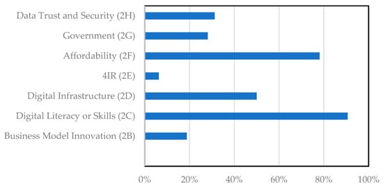 The identified challenges were categorized according to the elements of a digital ecosystem for agriculture; that is, digital platform (2A), business model innovation (2B), digital literacy or skills (2C), digital infrastructure (2D), 4IR (2E), and affordability (2F) (Figure 4). There were no challenges that were mentioned or discussed regarding digital platforms (2A). More than 50% of the challenges concerned digital infrastructure (2D), followed by the challenges related to affordability (2F) (more than 75%). The majority of challenges (more than 90%) regarding a digital ecosystem for agriculture concerned digital literacy or skills (2C).