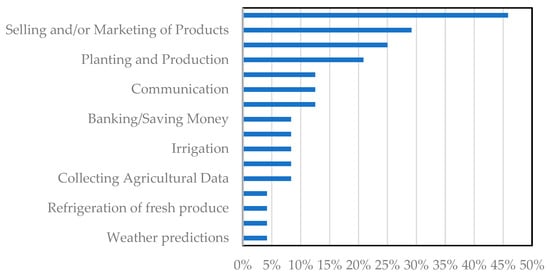 The systematic review also revealed efficiency, sustainability, transparency, a positive impact on agricultural income, real-time data collection, improving farming decisions and predictions, cash management, and financial identity as benefits of using digital solutions for smallholder farmers. Other interesting benefits of using digital solutions for smallholder farmers are a slowdown in migrating to cities [34], obtaining farming-related advice in one’s own language [35], new knowledge generation [36,37,38,39], and women’s empowerment [37].