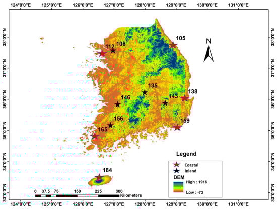 Climate change, shifts in the temporal trends of drought, and extreme occurrences in South Korea have generated considerable concern. Although changes in climate extremes should be regarded as significant determinants of climate change’s impact, research on their characteristics has been limited thus far. The spatial variation in climate in Korea is determined by key climate factors such as latitude, elevation, geographical location, land/sea heating properties, and ocean currents. In reaction to the East Asian Monsoon, it is hot and humid in the summer but cold and dry in the winter [38]. Due to the effects of the Eurasian continent, Korea has a predominantly continental climate. The climate of coastal areas, which is influenced mostly by the ocean, differs from that of inland areas [39]. On average, coastal regions experience a strong temperature gradient in the lower atmosphere at the land–ocean boundary. The rapid change in atmospheric temperature enhances horizontal and vertical pressure gradients in the atmosphere, which trigger the local wind system characterized by a flow from ocean to land during the day [40]. As a result, high evaporation from the ocean increases the moisture content in the atmosphere. This moist air mass hits the coastal terrain (or topography) and causes higher annual rainfall than the interior of the continent. After striking the coast, the air mass has no or very little moisture content to transfer to the interior of the continent and causes low or below average annual rainfall. Some attempts have been made to identify the extreme events in South Korea; however, the studies have not focused on coastal and inland areas [16,17].