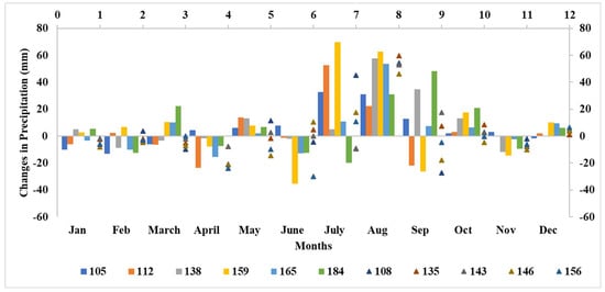 In the inland stations, the monsoonal months showed positive changes in precipitation; however, the summer and winter months mainly showed a negative trend in precipitation patterns. The Daegu (143) station, with less precipitation in the period under comparison, showed the most negative changes (Figure 2). Overall, all the stations indicated positive and negative monsoonal and winter precipitation trends. The Busan station showed the most positive and negative fluctuations in June and August.