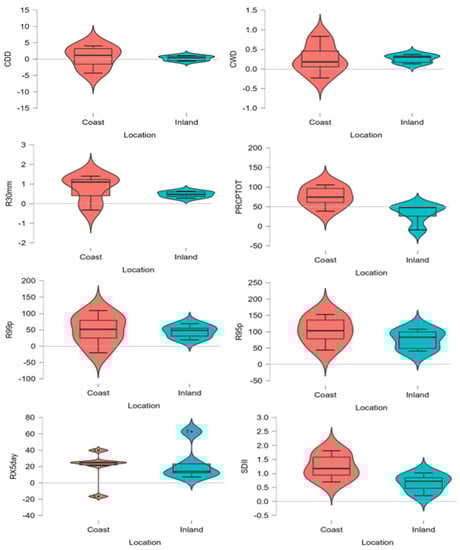 The CDD illustrates changes in dry spells for the inland stations, where the maximum positive trend is 1.03 and the negative trend is −0.67. In all stations, the CWD showed a positive trend, indicating that the number of dry days is steadily increasing. The PRCPTOT indices revealed that precipitation has increased in the inland areas; however, one station (146) showed a negative precipitation trend. The R30 mm showed a trend increase at the stations. These trends imply that rainfall intensity is increasing in the inland areas. The maximum five-day (RX5day) precipitation indices showed increasing trends in the inland areas, indicating an increased rainfall intensity (Table 3). The indices R95p and R99p showed a trend increase at the selected inland stations for heavy rainfall days. The SDII follows the same pattern, indicating an increase in wet days in inland areas. Overall, all the extreme precipitation indices showed increasing trends in the inland and coastal stations (Figure 3). The consecutive dry days (CDD) showed that the dry spell in the coastal areas and inland areas shows less changes. The consecutive wet days (CWD) showed a positive trend. The total precipitation (PRCPTOT) in the coastal stations increased gradually and exhibits a high peak in the plots. The intensity of heavy rainfall on heavy rainy days when rainfall was at least 30 mm (R30 mm) increased. The maximum five-day precipitation quantity (RX5day) showed an upward trend. The same increasing trend was observed for the total annual precipitation from heavy rainy days (R95p), the total annual precipitation from very heavy rainy days (R99p), and the daily precipitation intensity (SDII).