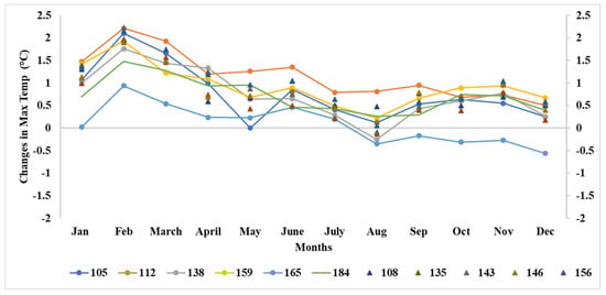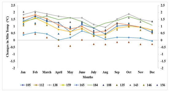Regarding the minimum temperature, every weather station in the coastal areas showed an increasing minimum temperature trend in most of the months. In the winter, there were many variations in the minimum temperature. Changes were observed at the Pohang (138) and Jeju (184) stations, which showed monthly temperature changes of more than 1 °C. Noteworthy changes in the minimum temperature occurred in February across all of the locations. The smallest temperature change was recorded at the Mokpo (165) station (Figure 3). The minimum temperature in the selected inland stations showed an increasing trend. The maximum changes were observed in February; the winter months showed the maximum positive temperature changes at all stations except Chupungryeong (135). The temperature at the Chupungryeong (135) station dropped throughout the monsoon months, indicating negative inclinations. Noteworthy changes occurred in the months of January, February, and March (Figure 5).