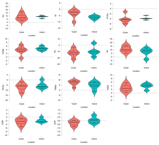 Variations in regionally averaged (red for the coastal station and blue for the inland stations) temperature extremes indices over the time period 1961–2020. Boxes indicate the interquartile model spread (25th and 75th quantiles), with the horizontal line indicating the ensemble median and the whiskers representing 1.5 times the interquartile range of the upper and lower quartiles. The violin-like shapes (violin plots) represent the density of each index.