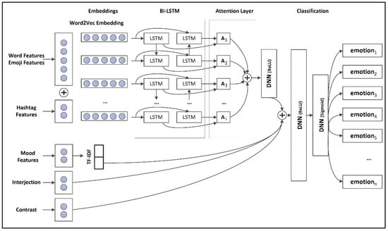 Figure 1 shows the classification model. It takes the text (Tweet) as input, and then it performs data cleaning, extracts hashtag and mood features, calculates sentiment contrast score (SCS), and obtains the total number of interjection (INTJ) features in each Tweet. The text features and hashtag features are then concatenated to return a single output. The output of the concatenation was fed into Bi-LSTM with 64 units with a ReLU activation function. To avoid overfitting, a dropout layer was added. An attention model was then designed to give more weight to important words. The attention features, mood features, SCS, and INTJ features are concatenated, and then fed into dense neural networks (DNNs). Finally, the sigmoid activation function was added as an output layer for the classification of the Tweets into one or more emotion classes (Figure 1).