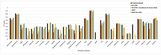 It can be observed from Table 10 that the proposed model attained the best F1-score on the emotions of gratitude (90%), amusement (82%), and love (81%), which are positive emotions with more explicit emotional words. The lowest F1-score is recorded for realization (18%), grief (22%), and embarrassment (28%).