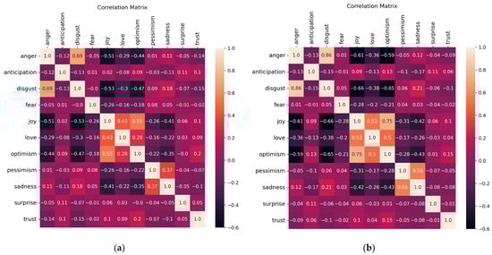 The SemEval-2018 dataset provided by Mohammad et al. [58] as a part of the competition SemEval-2018 Task 1: Affect in Tweets (task E-C), available at https://competitions.codalab.org/competitions/17751#learn_the_details-datasets (accessed on 28 January 2023). The GoEmotions dataset is provided by Demszky et al. [43], and it is available at https://github.com/google-research/google-research/tree/master/goemotions/data (accessed on 28 January 2023).