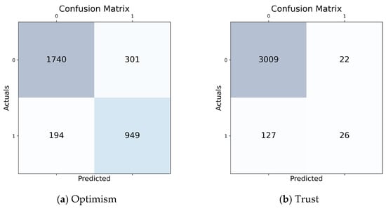 We illustrated the confusion metrices (Figure 6) for the emotions of trust and optimism on the SemEval-2018 dataset, which scored the highest and lowest accuracy, respectively.