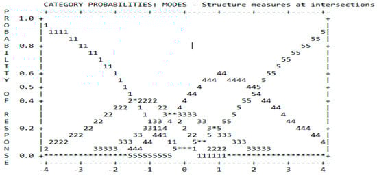 The Rasch analysis was utilized to determine whether the response probability was evenly distributed across scales. A summary of the category structure in relation to the scale gradation and the intersection’s size structure is provided in Table 3, with Figure 1 displaying the same information. The observed count represents respondents’ responses to the ranking scale. Category 4 was the most frequently chosen response (n = 22; 43%), followed by Scale 3 with 22 respondents (21%), while 8 (16%) respondents selected category 5, 7 (14%) respondents selected category 2, and the last 3 (5%) respondents selected category 1. The observed averages revealed a systematic pattern in the respondents’ responses, with a reasonably typical progression from negative to positive expected for a systematic instrument. Therefore, the calibration scaling study using the instrument’s five scales indicated good validity.