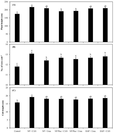 Plant growth attributes like shoot fresh and dry weights, plant height, cob fresh and dry weights, no. of grain rows cob−1, and cob length improved by all kinds of fertilizer combinations when compared with the control (Figure 1 and Figure 2). The application of NP + CAN increased the plant height by 21% as compared to the control. When comparing the various combinations of fertilizers, NP + CAN increased the plant height by 4% as compared to DAP + urea. By contrast, the combination of CAN and DAP remained insignificant for plant height when compared with the DAP + urea. Similarly, a maximum no. of grain rows cob−1 was found in NP + CAN as compared to all the other fertilizer supplies and the control. When compared with the conventional fertilizer supplies, no. of grain rows cob−1 was found significant in NP + CAN treatment. Furthermore, cob length was found significant in all the fertilizer applications when compared with the control.