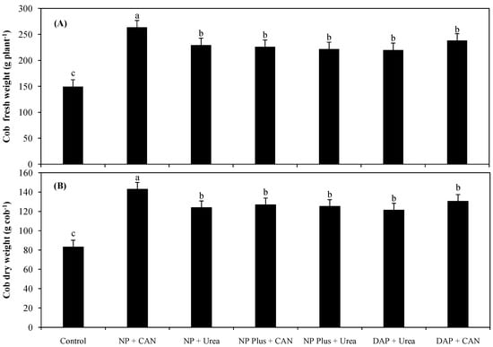 Cob fresh weigh (A) and cob dry weight (B) as influenced by N sources. All values are average of three years of experimental data ± S.E of three replicates, whereas lower-case letters indicate significance among the treatments at p ≤ 0.05 level.