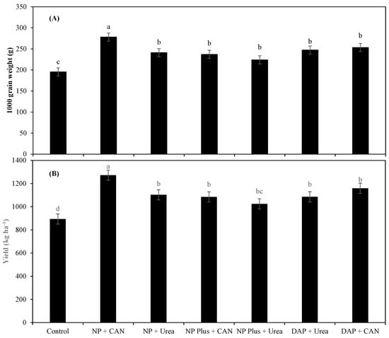 The 1000-grain weight (A) and maize grain yield (B) as influenced by N sources. All values are average of three years of experimental data ± S.E of three replicates, whereas lower-case letters indicate significance among the treatments at p ≤ 0.05 level.