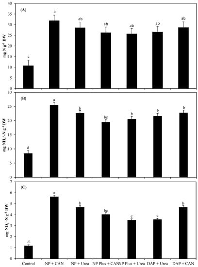 In the present study, NP fertilizer (pH 3.5) and CAN (pH 7.0) contained balanced proportions of NH4+-N and NO3−-N (Table S1). These balanced proportions in NP + CAN influenced the soil pH to some extent as compared to the control and all other fertilizer sources (Table 2). The change in the micro-environment of soil under the influence of NP + CAN influenced the physicochemical properties of the soil and nutrient availability, particularly mineral N and the other two inorganic N-forms. In comparison to all other fertilizer combinations, NH4+-N in the soils was much greater in the NP + CAN combination.