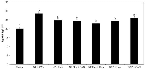 NRE (kg kg−1 dry weight) of maize as influenced by N sources. All values are average of three years of experimental data ± S.E of three replicates, whereas lower-case letters indicate significance among the treatments at p ≤ 0.05 level.