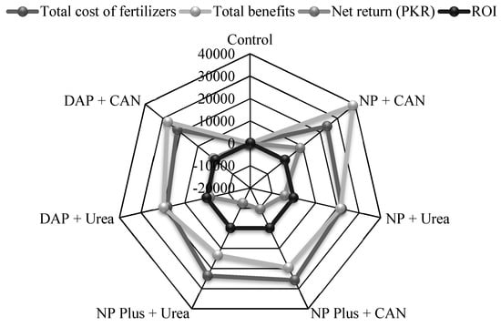 Pakistan, being a developing country, requires assistance in addressing food security challenges. In this sense, chemical fertilizers are required for improving the country’s agricultural crop yield. Excessive use of chemical fertilizers, on the other hand, not only reduces plant growth and productivity but also degrades soil health. As a result, it is critical to reduce the usage of extra fertilizers and other energy inputs by using the following strategies: the right source, right rate, and right timing []. In addition, economic analysis of the inputs is required to compare the effectiveness of different fertilizers in terms of net return. In the present study, the highest net return of the maize in NP + CAN is indicative of the right sources of fertilization. Moreover, both NP and CAN application did not affect ROI, which indicates that the end user earned a profit by using Sarsabz NP and CAN than all the other fertilizer sources. It has been suggested that farmers need to apply NP and CAN fertilizers in their soils instead of conventional fertilization.