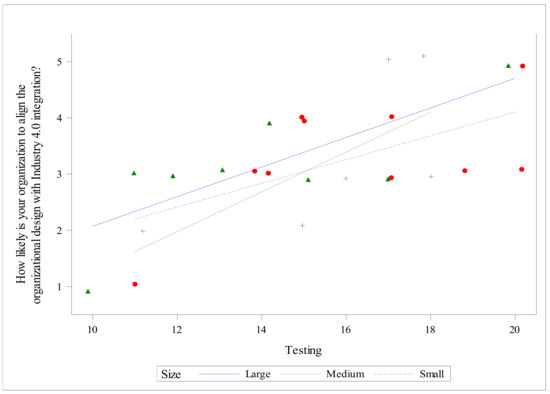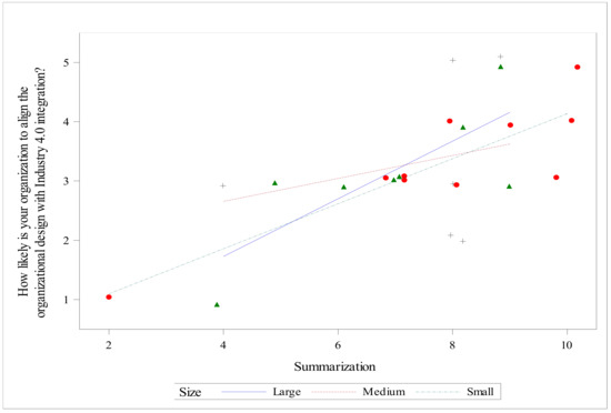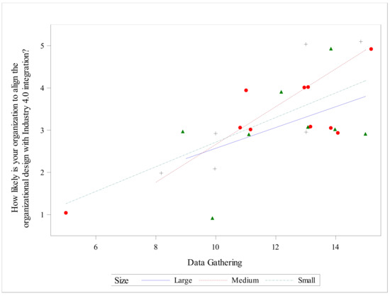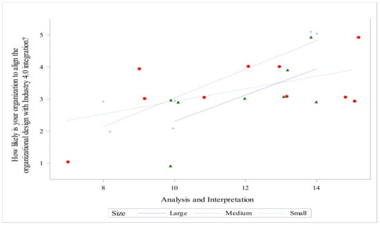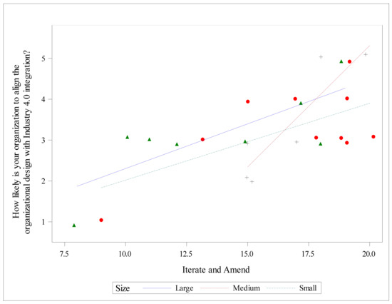 Individual scatter plots of the socio-technical constructs of Data Gathering (C1), Analysis and Interpretation (C2), Summarization (C3), Testing (C4), and Iterate and Amend (C5) on the x-axis and Industry 4.0 (Q12) on the y-axis were created for the manufacturing firms surveyed. These are illustrated in Figure 1, Figure 2, Figure 3, Figure 4 and Figure 5 below. The three lines are the simple linear regressions for small, medium, and large companies. The linear regression highlights positive slopes for all three business sizes, indicating that, as Industry 4.0 integration increases, the socio-technical constructs are increasingly utilized within the work organization. For example, in Figure 1, medium-sized companies integrating Industry 4.0 are more aligned with the socio-technical construct of Data Gathering than small and large companies.