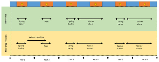 Reference six-year crop rotation (green background) compared with a new crop rotation with winter camelina as a relay crop between spring barley and peas (yellow background).