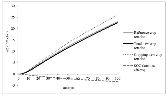Time-dependent temperature response over 100 years assessed per hectare for the reference crop and new crop rotation including winter camelina. “Total new crop rotation” represents the climate impact including soil organic carbon (SOC) effects.