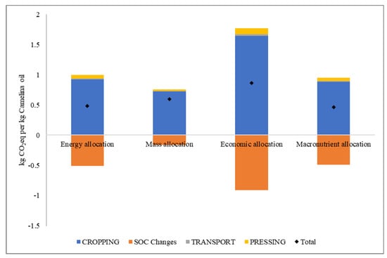 Depending on the allocation method (energy, mass, or economic allocation), the total climate impact, including SOC effects of camelina oil production, varied between around 0.5 and 1 kg CO2 eq/g camelina oil (Figure 5). The cropping system had the highest impact in the different allocations, which indicates the importance of good crop management to maintain yield in the following crop and optimization of cropping systems with respect to, for example, nitrogen use efficiency and yield to achieve sustainable crop production in practice [20]. In the case of camelina grown in Sweden, field trials are needed to establish agronomic practices. Further, in the cropping phase, nitrogen fertilizer-related emissions are dominating. It is important to highlight that the nitrogen fertilization rates for camelina grown in Swedish crop rotations are unknown, and the rate in the present study was based on earlier studies. To lower climate impact from cropping, it would be beneficial to, for example, grow camelina after a crop that tends to leave available nitrogen in the soil; in that way, camelina could utilize that nitrogen and potentially decrease nitrogen leaching while fertilization rates could be kept lower.