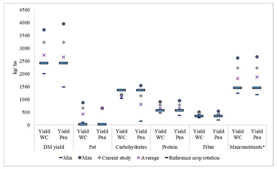 Sensitivity analysis where yield of winter camelina (WC) and the following pea crop were varied separately based on literature values. Only combined yield of camelina and peas is shown, since these were the only crops affected by introduction of camelina in the crop rotation. Macronutrients* were weighted using a nutrition index (Bajželj et al. [3]), so the results cannot be compared with other results in the diagram, i.e., macronutrient production can only be compared between the two crop rotations.