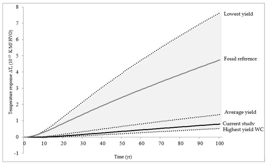 Time-dependent temperature response from production and use of 1 MJ hydrogenated vegetable oil (HVO) from camelina oil compared with fossil diesel in sensitivity analysis where yield of winter camelina (WC) was varied based on field trial data from earlier studies.