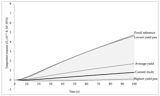 Time-dependent temperature response from production and use of 1 MJ hydrogenated vegetable oil (HVO) from camelina oil compared with fossil diesel in sensitivity analysis where yield of the following crop (pea) was varied based on field trial data from earlier studies.