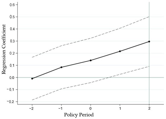 Analysis using the multi-period difference-in-differences model necessitates that data from each province adhere to the prerequisite of passing the parallel trend test. It requires that the trends in the regional innovation ecosystem performance of both treatment and control groups remain relatively consistent during the pre-intervention period of the innovative provincial policies. In this study, we conduct a parallel trend test by generating dummy variables for the pre-1 to pre-3 periods, the current period, and the post-1 to post-2 periods. These variables are determined by the year of implementation for each province’s policy. The third pre-policy period is discarded as the base period, while the remaining periods are used as explanatory variables for regression analysis with the dependent variable, which is the performance of the regional innovation ecosystem. The figure of parallel trend test is shown in Figure 2.