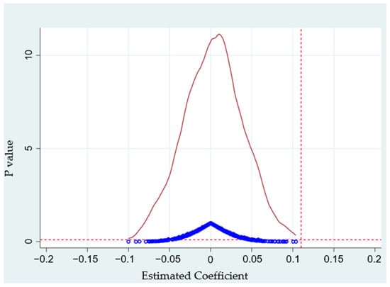 We conduct a placebo test in this paper to test the robustness of the model and examine whether the changes in the post-policy sample are due to other random factors besides the policy intervention. Since the policy periods in multi-period DID vary, we randomly generate a treatment group and randomly select a sample period for each sample object to obtain a pseudo-policy dummy variable. Based on this counterfactual sample, we conduct multi-period DID regression. Suppose the regression results for the estimated quantities remain significant under various fabricated scenarios. In that case, it suggests that the original estimates might be biased and that other policies or random factors could have influenced the changes in our dependent variable. We repeat this process 500 times, obtaining the coefficient estimation results of the random samples and drawing the kernel density distribution graph. The dotted line in the graph represents the estimated value of the DID coefficient mentioned above. As depicted in Figure 3, the true sample estimated coefficient, represented by the vertical dotted line, is significantly different from the mean of the kernel density distribution. This indicates a significant disparity between the estimated results of the random sample and the estimated results of the true sample, which means the placebo test is passed.