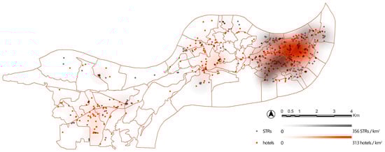 Geographical distribution of STRs and hotels in Yuzhong District. (Source: the authors).