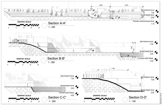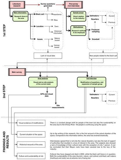 Due to the lack of information of the area, it was also needed to integrate quantitative methods into the research. These methods range from visual analysis to historical analysis and serve a specific purpose: the completion of information that, due to various factors, interviews cannot obtain. In order to be able to link the quantitative methods with the data obtained by the qualitative method, methodological triangulation was employed, specifically “between-method triangulation.” This method is proper when one chooses to analyze the same phenomenon (loss of black salt space value) from different angles [35]. Due to the age of members from the black salt industry, there is a possibility that much data may need to be supported by external information. The results are twofold: the first is a deeper understanding of the information gathered. Second, bias that may result from the perspectives of each of the interviewees is eliminated. Methodologies where qualitative and quantitative data are used to understand a phenomenon have already proved successful in the region [14]. The methodology implementation was divided into three steps: research background, primary survey, and results. Research background consists of research and compilation of all existing data by previous researchers as well as local authorities. This creates an understanding of the gaps and needs that the site maintains. All this has been discussed in Section 1.