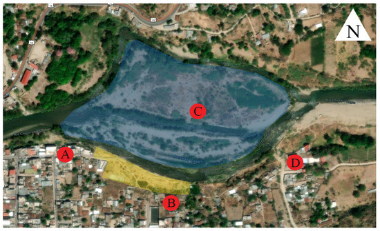 Black salt beach and the 4 main points that present modifications due to river Chixoy. Areas “A” to “D” where the focus of this analysis due to the constant changes presented. Area “A” is the west road connecting to the current salt beach, area “B”. Meanwhile, area “C” is the space which Ordoñez Chocano mentions as previous salt beach area. This is corroborated by area “D”, where a road that connects to nowhere is located. This area currently is in ruins, and the state of the road close to the river Chixoy is extremely deplorable. [Esri historical map location of the salt beach area, inside Sacapulas’ town. Modified by author]. Retrieved from https://livingatlas.arcgis.com/wayback accessed on 2 January 2023.