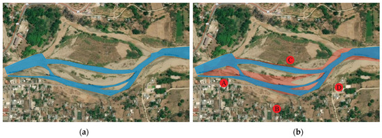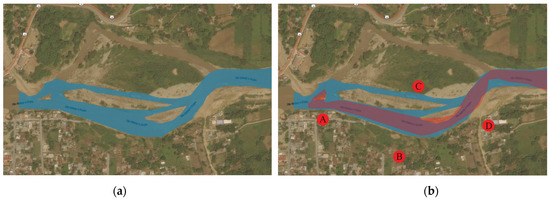 Regarding the use of imagery data, based on the information recapitulated in Section 1.3, it was chosen to use to the earliest imagery data available. It was decided to use the data system of the WorldImageryMap project to access visual information available by GPS. Unfortunately, due to the area’s remote location, the oldest information for the region is from 6 February 2011, while the most recent information is from 31 March 2021. Another territorial tool was developed locally by the local disaster reduction organism, CONRED (“National Coordinator for Disaster Reduction” in spanish). It consists of regional maps identifying the areas with the highest risk of natural disasters. The prediction of this threat uses the TerraView 4.2.2 methodology and its plugin TerraHydro [38].