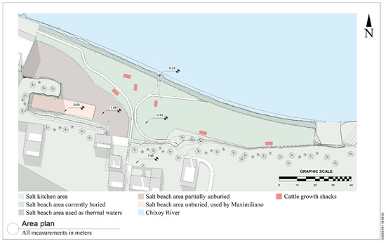 To determine the evolution of the space and to define its current state, the space was measured by a site visit conducted in September 2022. The onsite survey took 2 days to develop the specific planimetry of the beach space. This information was taken by two people (the researcher and his assistant) and focuses specifically on the beach area and its immediate surroundings. Both terrain and elevation data were taken for the space, and the southern area where the salt kitchens are located was studied. Up to this moment, this is the only existing document of the planimetry of the beach, division of the space, and current situation. This information was supported by the use of satellite maps based on Google Earth to determine areas where access was impossible due to the type of terrain, specifically the areas along the Chixoy River which are extremely dangerous. The expected margin of error is 1.8 m, according to previous studies [39]. For the elevation data collection, it was performed manually on-site.