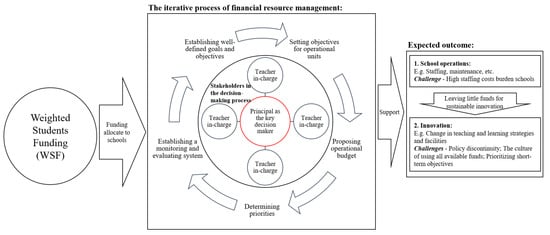 Theoretically, by using these five iterative steps of financial resource management, which are commonly employed globally [,], schools can support initiatives for sustaining improvement within schools. Nevertheless, in practice, there are many impediments to the effective application of WSF that hamper school innovation [,].