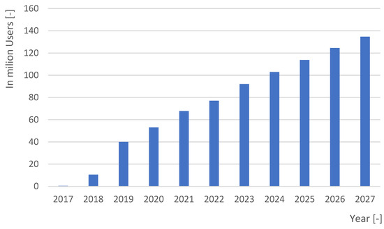 In recent years, electric scooters (also referred to as e-scooters) have gained popularity around the world. Although the first mention of the use of electric scooters dates to 1915 [1], they have been of particular interest since their dissemination in shared mobility services, i.e., since 2017, when the first systems of short-term rental systems of electric scooters appeared [2]. In 2017, two leading companies on the scooter-sharing market, Bird and Lime, launched dockless e-scooters [3]. Since its inception in Santa Monica, California, United States, Bird has expanded its services to more than 100 cities and achieved a valuation of $2 billion in 2018 [4]. In the same year, its competitor Lime collected over 11.5 million rides [4]. The wide interest in scooter-sharing translated into a significant increase in the number of users of their systems. In 2017, there were 0.52 million registered users worldwide, while in 2022, the number of users reached more than 77 million [5]. Detailed data on the number of users with a view to 2025 is presented in Figure 1.