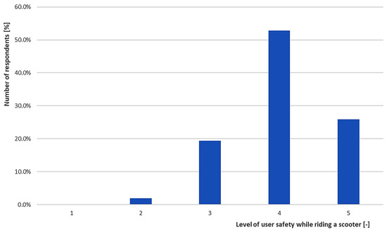 The next step was to indicate travel destinations using scooters from scooter-sharing. It was indicated that 12% of respondents use scooters to travel to/from work, 14% traveling to/from school/university, 11% traveling to/from shopping, 14% traveling to/from entertainment venues, e.g., to/from the cinema, or to participate in a mass event, e.g., a concert, a match; for restaurants, cafes, etc. Furthermore, 23% of the respondents used scooters only for testing, because they wanted to check how the service works, 24% of respondents used the system for fun, and 2% of respondents used scooters to travel to tourist attractions, for example, to/from an exhibition or to/from a museum. Detailed data are presented in Table 4.