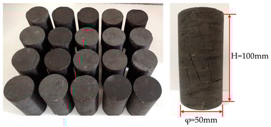The study area of this work is the Baijiao coal mine of the Sichuan Coal Group Furong Company in Yibin City, Gongxian County, Southwest China. The coal is anthracite with a natural density between 1.53 and 1.64 g/cm3, and the mineral composition of the coal samples is mainly kaolinite, quartz, calcite, etc. [10]. The coal samples used in the test were taken from the same mining face. Selected intact large coal blocks with good homogeneity were wrapped and sealed with polyethylene cling film and transported to the indoor laboratory for further processing. The large coal samples were drilled into cylinders of 50 mm diameter with a special sampling machine, and the cylindrical coal was cut into 100 mm lengths with a cutting machine and polished into φ × h = 50 mm × 100 mm standard specimens with section non-parallelism and non-verticality less than 0.02 mm (Figure 1). These standard coal samples were sealed with polyethylene film and stored in a cool place.