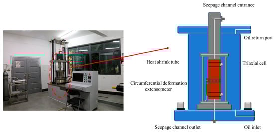 The study used a fracturing and seepage experimental system for multi-physical field and multiphase coupling of porous media (THM-2) developed by Chongqing University, as shown in Figure 2. The system consists of a main frame, an electrohydraulic servo hydraulic pump station, a pneumatic and hydraulic pressure supply system, and a measurement and control system. The test equipment can provide a maximum axial pressure of 1000 kN and a maximum confining pressure of 60 MPa, and is capable of accepting two specimen sizes (φ50 mm × 100 mm and φ100 mm × 200 mm) for the test. The displacement monitoring system can monitor maximum axial and radial displacements of 60 mm and 12 mm, respectively. The system is capable of simulating multiple coupled conditions such as in-situ stress, mining-induced stress, temperature, and fluid pressure, and conducting uniaxial, triaxial mechanical tests, hydraulic fracturing tests, permeability tests, etc., on coal, sandstone, and other materials. It possesses high reliability and accuracy [22,23]. Before conducting the tests, we performed a seal integrity check on the testing equipment to ensure that the permeability system had good sealing performance prior to formal testing.